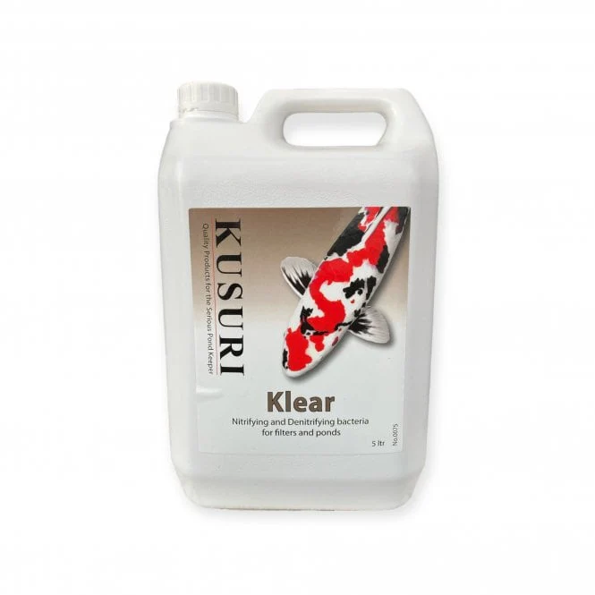 To improve water clarity in conjunction with the reduction of the Nitrates, soluble Phosphates, and algae use 400ml of Kusuri Klear, weekly, for ponds up to 9,092 litres (2,000 gallons), adding a further 25ml per 4,546 litres (1,000 gallons) of pond water.